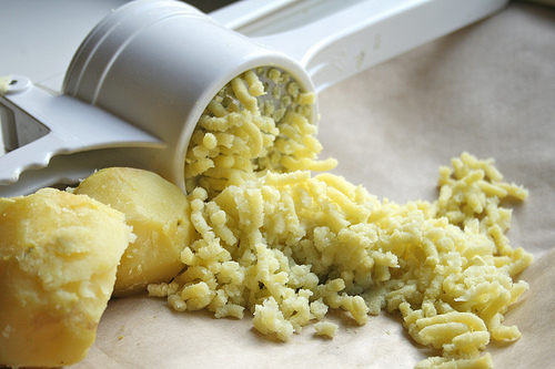 2 LB yellow wax potatoes 1/2 cup freshly grated Parmesan or Grana Padano Generous grinds of salt and pepper 2 eggs 2 cups flour Semolina or Rice flour just for dusting